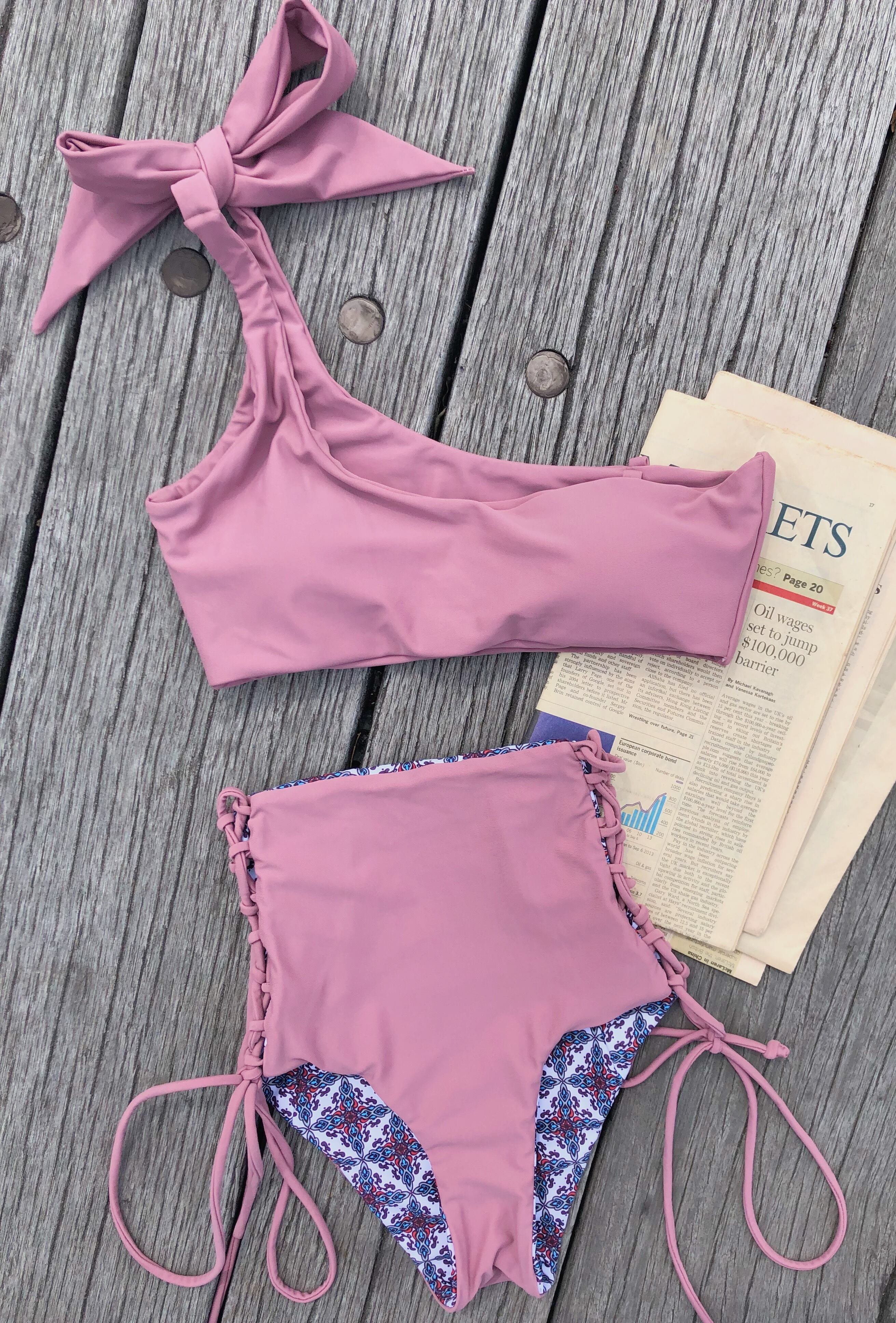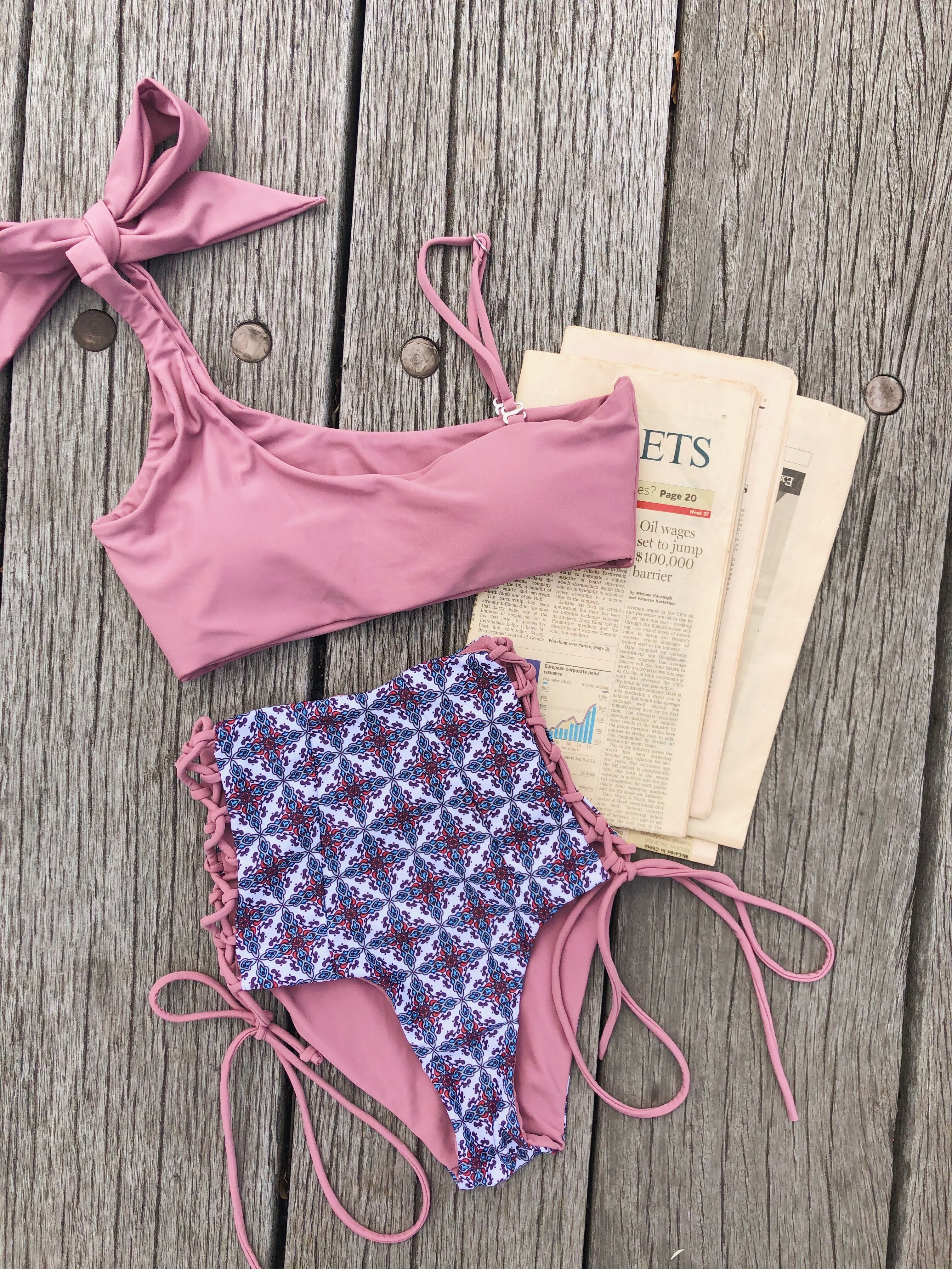 MILIMILI-one shoulder high waist reversible bikini【mexican tile×sand pink】