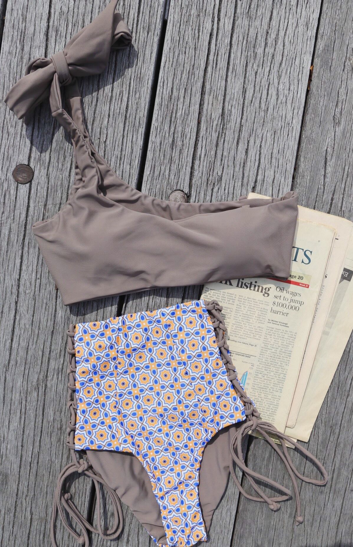 MILIMILI-one shoulder high waist reversible bikini【moroccan tile×sand gray】