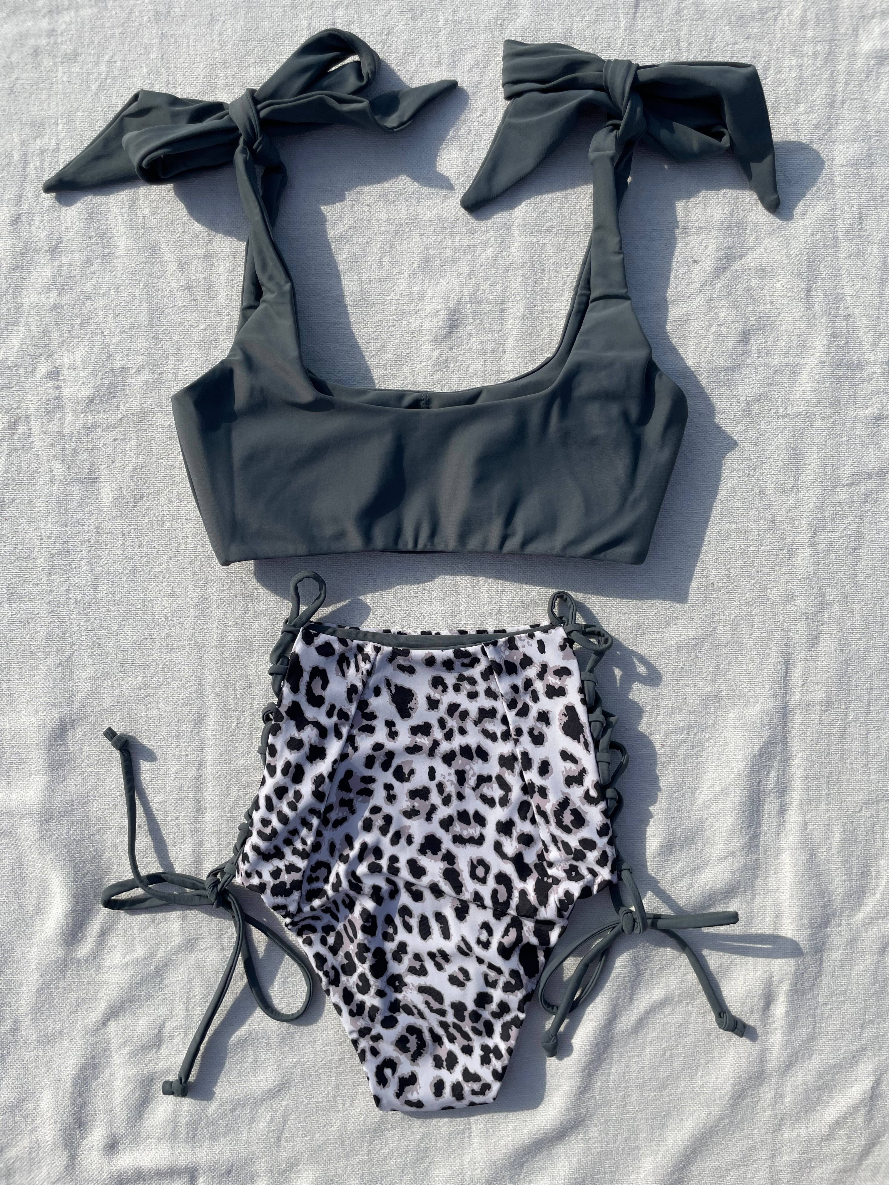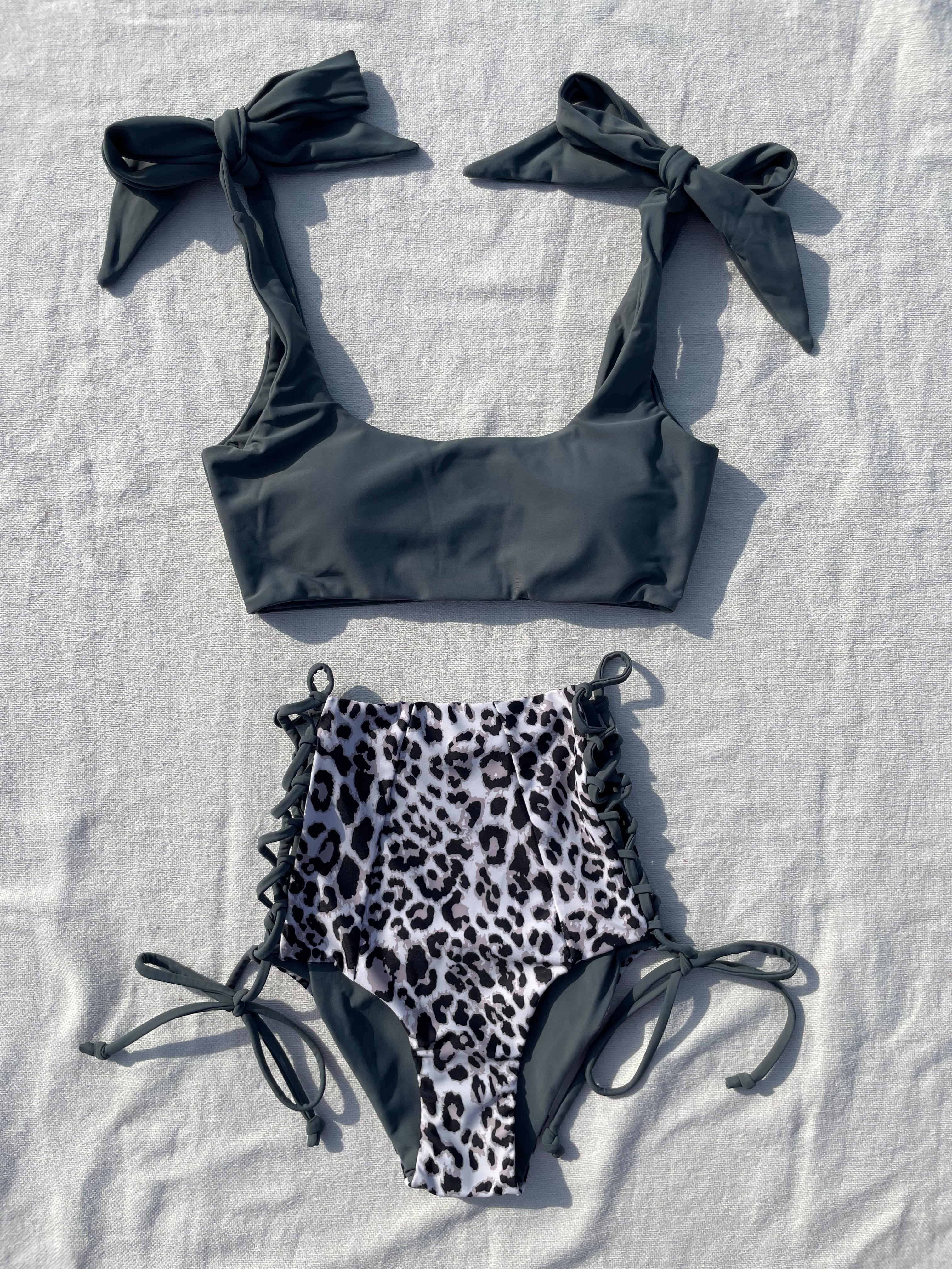 shoulder ribbon high-waist bikini【sand navy×tiger】
