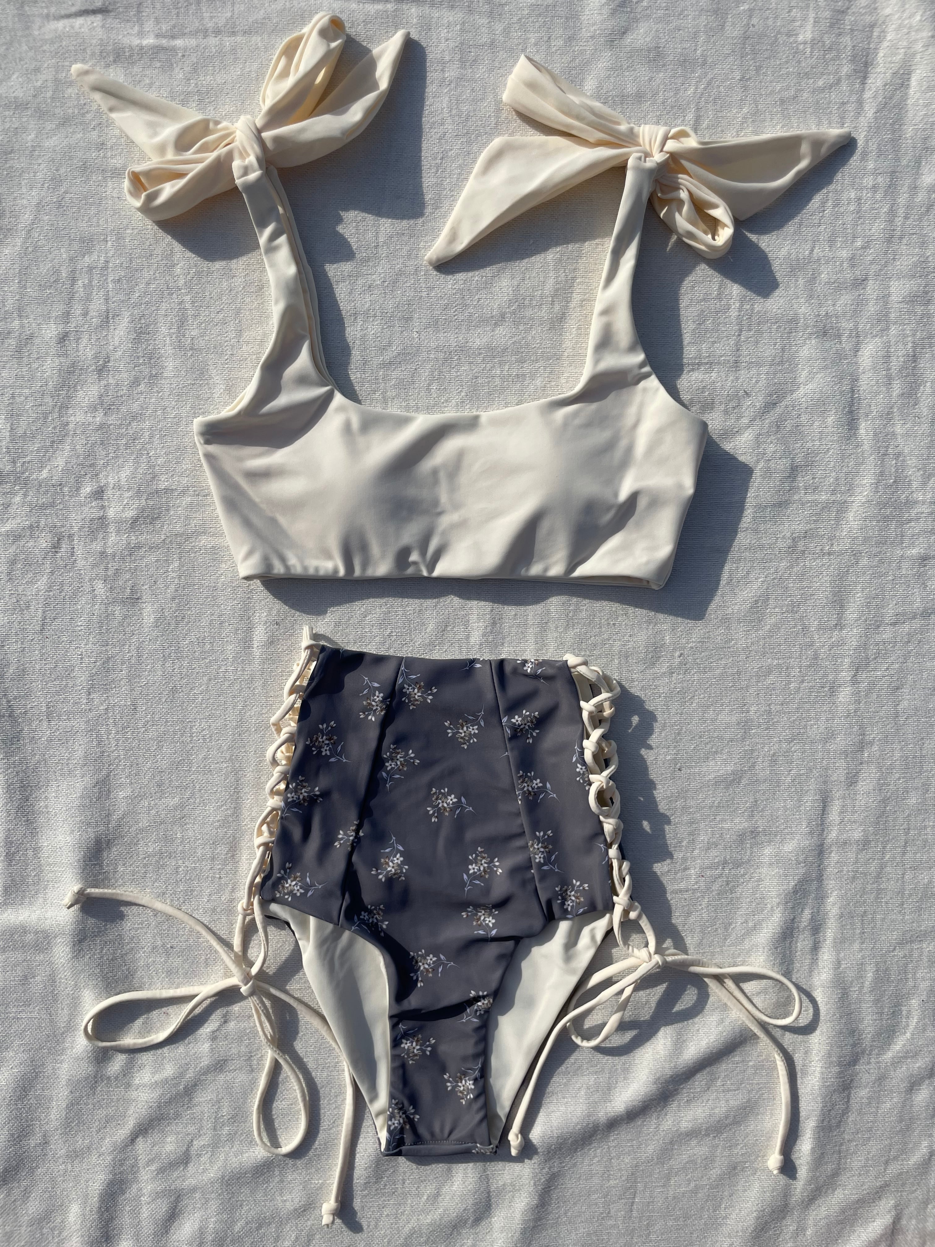 shoulder ribbon high-waist bikini【milk× smoky Daisy】