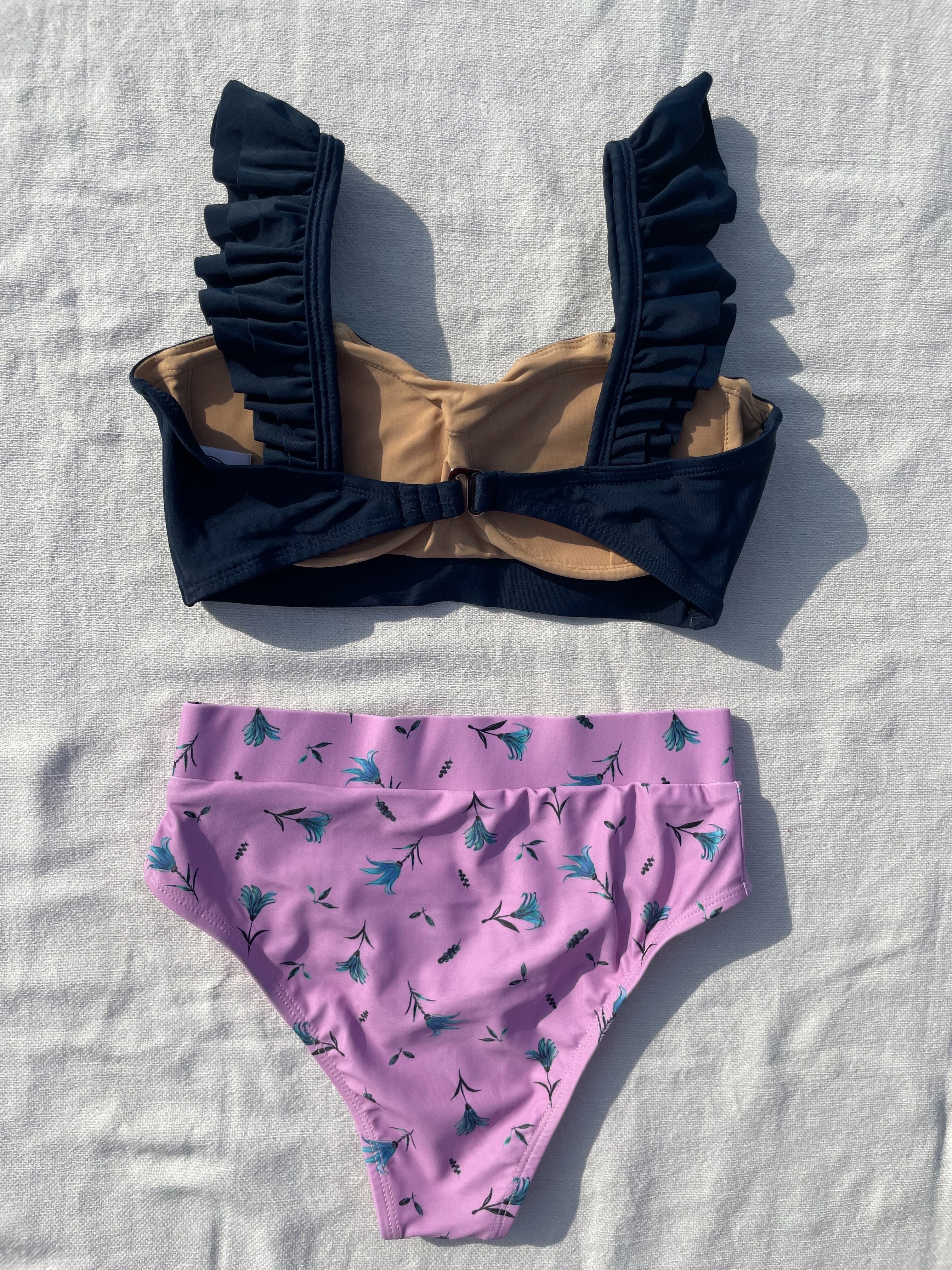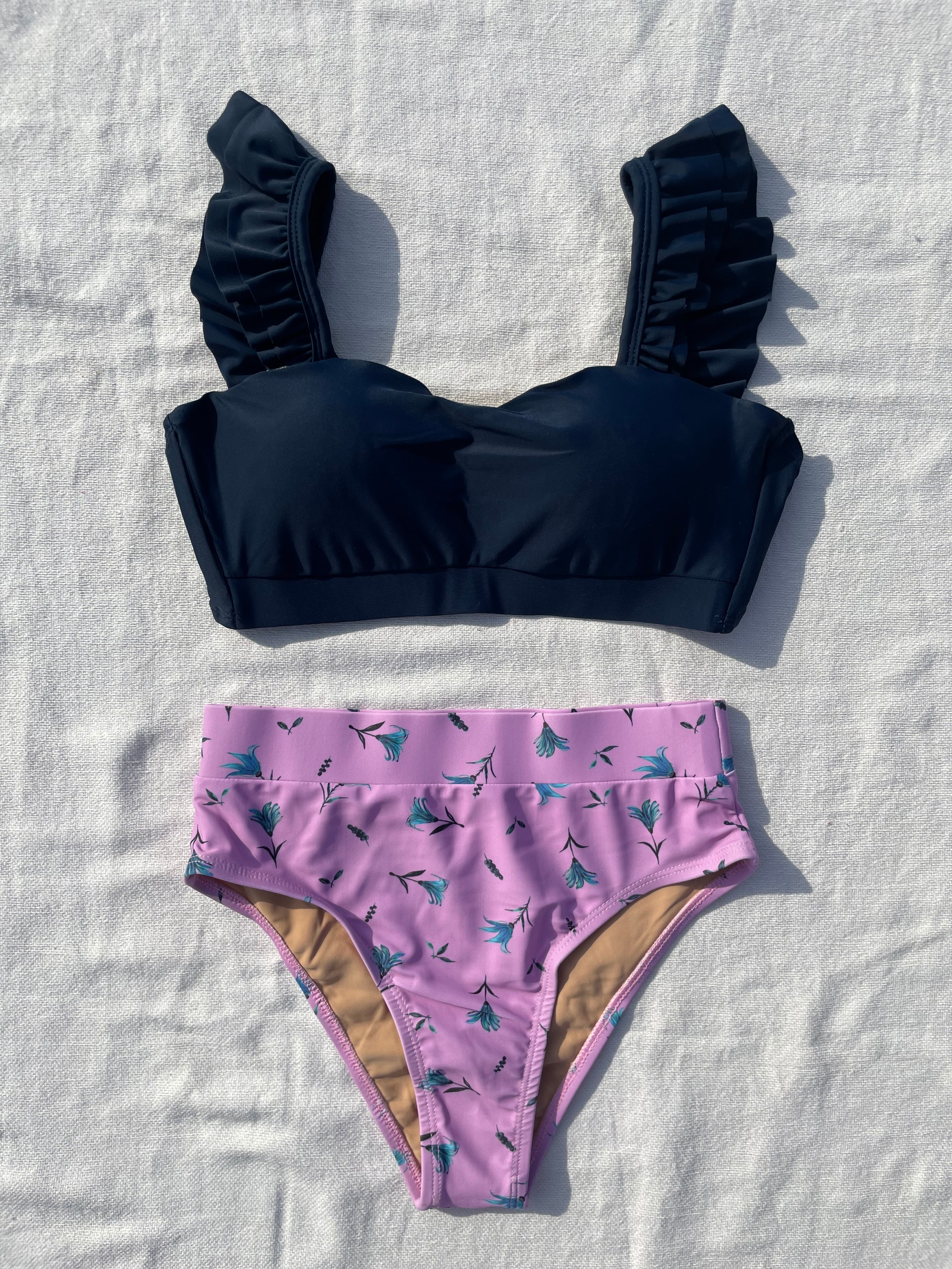 frill shoulder high waist bikini【navy×kush Daisy】