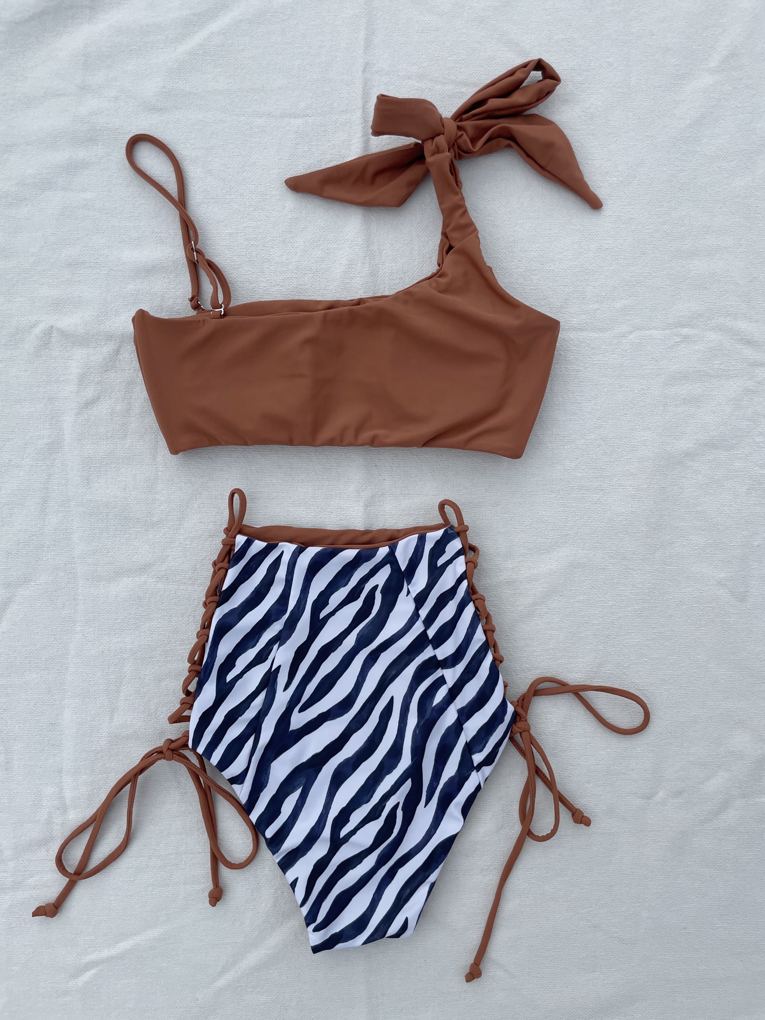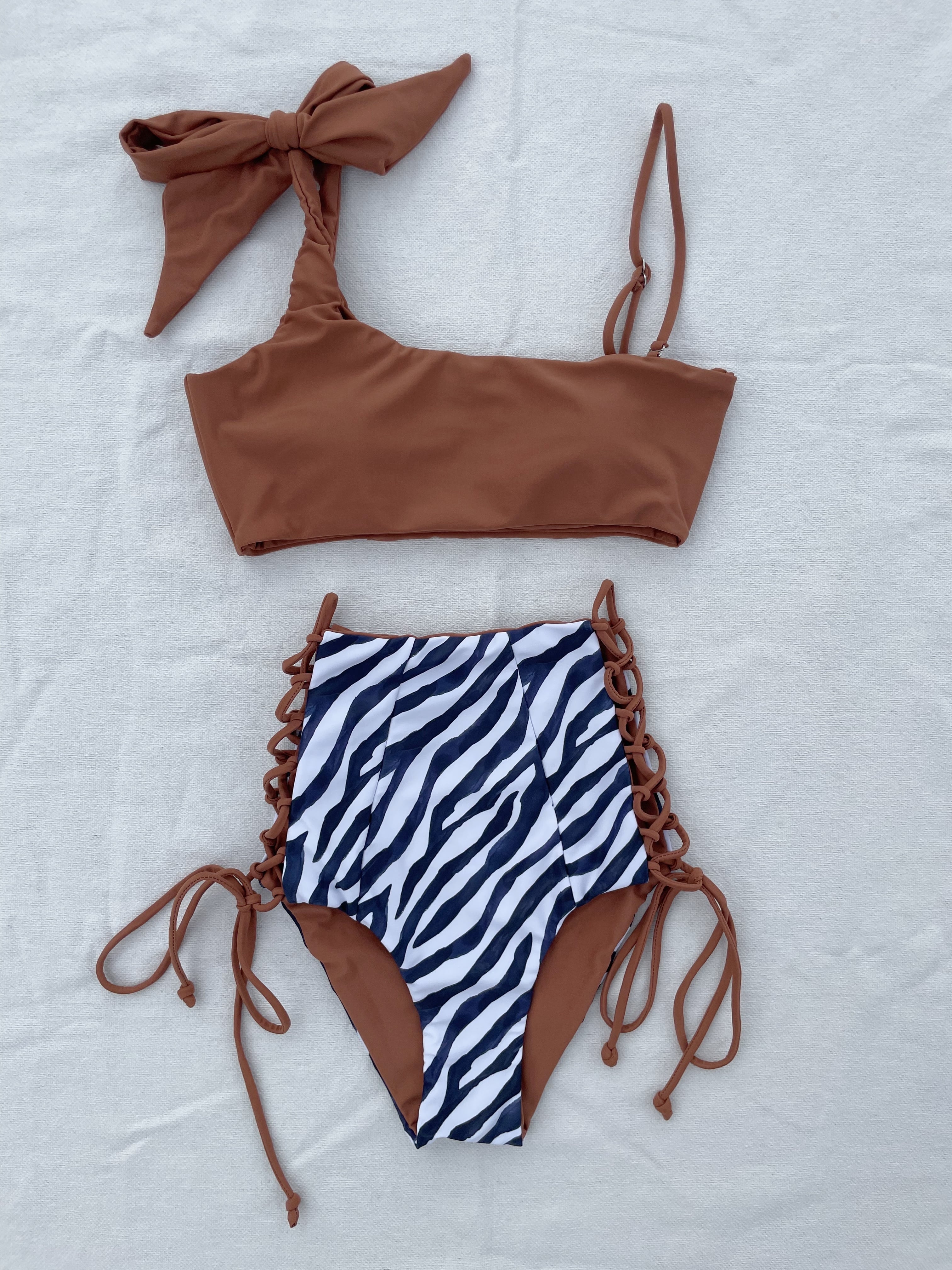 MILIMILI-one shoulder high waist reversible bikini【smoky zebra×sand orange】